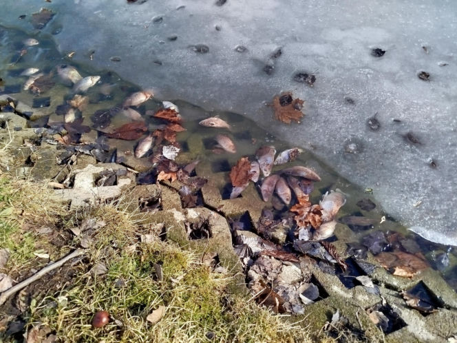 Martwe ryby w stawie na terenie Parku Aleksandria w Siedlcach