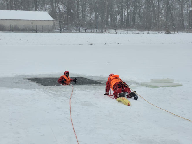 Strażacy z PSP Siedlce i lokalnych jednostek osp szkolili się z zakresu ratownictwa lodowego. Ćwiczenia zorganizowano na zbiorniku wodnym w Niwiskach w gm. Mokobody.