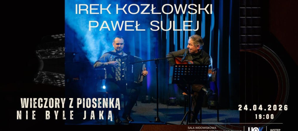 – Zapraszamy na koncert dwóch wyjątkowych artystów. Irek Kozłowski – gitarzysta i wokalista, swoim charakterystycznym głosem wyśpiewa nam kilkanaście muzycznych historii. Jego ballady, pieśni i piosenki to niezwykła muzyczna podróż przez słowo i dźwięk. Paweł Sulej to wirtuoz akordeonu, którego nuty trafiają w sam środek duszy. Wrażliwość muzyczna Pawła, słyszalna w każdym dźwięku jego instrumentu, to doskonałe dopełnienie tego wyjątkowego wieczoru. Zapraszamy wszystkich miłośników nastrojowej muzyki, poezji śpiewanej i dźwięków płynących prosto z serca. To idealna okazja, by na chwilę zatrzymać się w codziennym biegu i odpocząć w świecie muzyki i pięknego słowa. Nie przegapcie tego wyjątkowego wydarzenia! – zachęca Tomasz Salach, kierownik UOK.